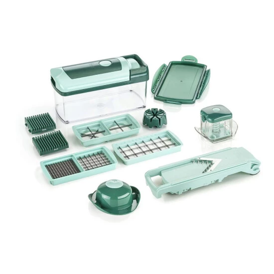 Zahlreiche Zutaten in ansprechende Würfel oder Stifte, gleichmäßige Streifen, Viertel, Achtel oder saubere Scheiben zu schneiden ist sehr mühsam. Das kostet nicht nur Zeit, man benötigt auch unzählige Küchenhelfer wie Messer, Schüsseln, Schneidbretter u. v. m. Diese benötigen viel Stauraum in der Küche und außerdem hat man sie nicht immer gleich zur Hand.