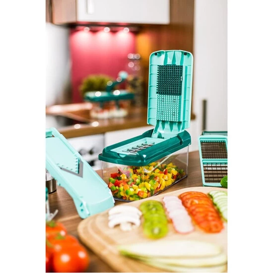 – Das Multischneider-Set als Küchenhilfe ist ein geniales System zur Zubereitung von Salat, Obst- und Gemüsegerichten, Zwiebel, Tomaten, Kartoffeln, Salat etc.. Sie können das Zubehör sogar platzsparend direkt im Behälter (2500ml) aufbewahren